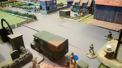 The Home Guard truck providing great cover as the Paras reach the village square.